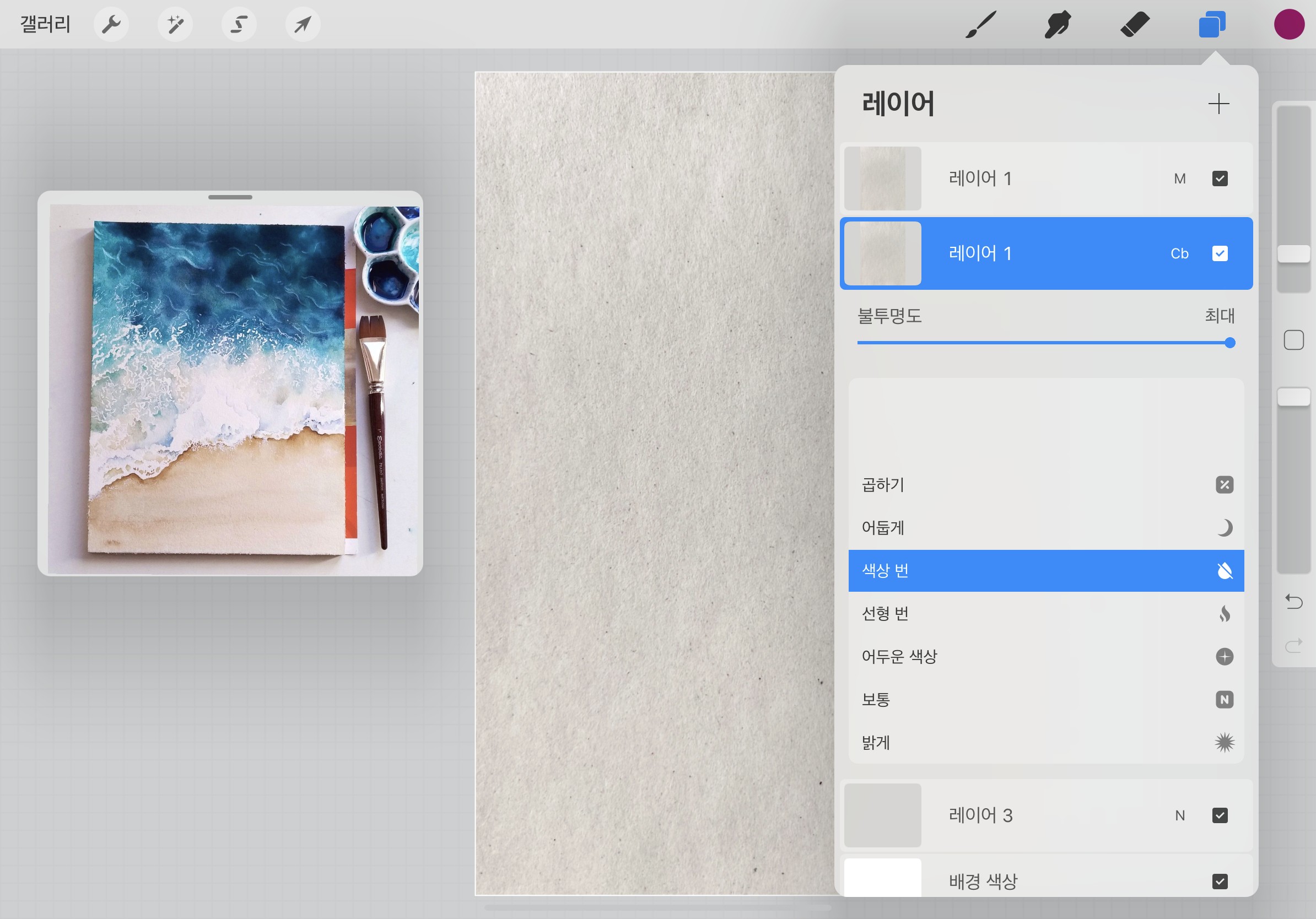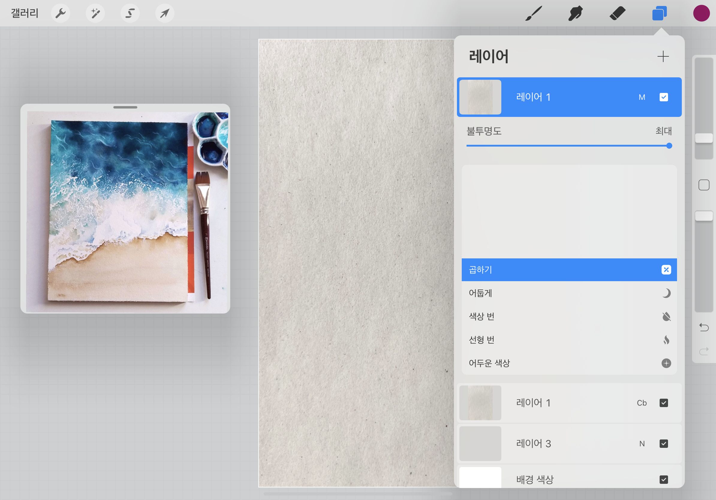 그리고 삽입한 캔버스 레이어를 복제를 해줍니다(레이어 1 복제). 복제를 한 레이어 하나는 "곱하기"로 설정해주시고, 하나는 "색상번"으로 설정해 주세오.