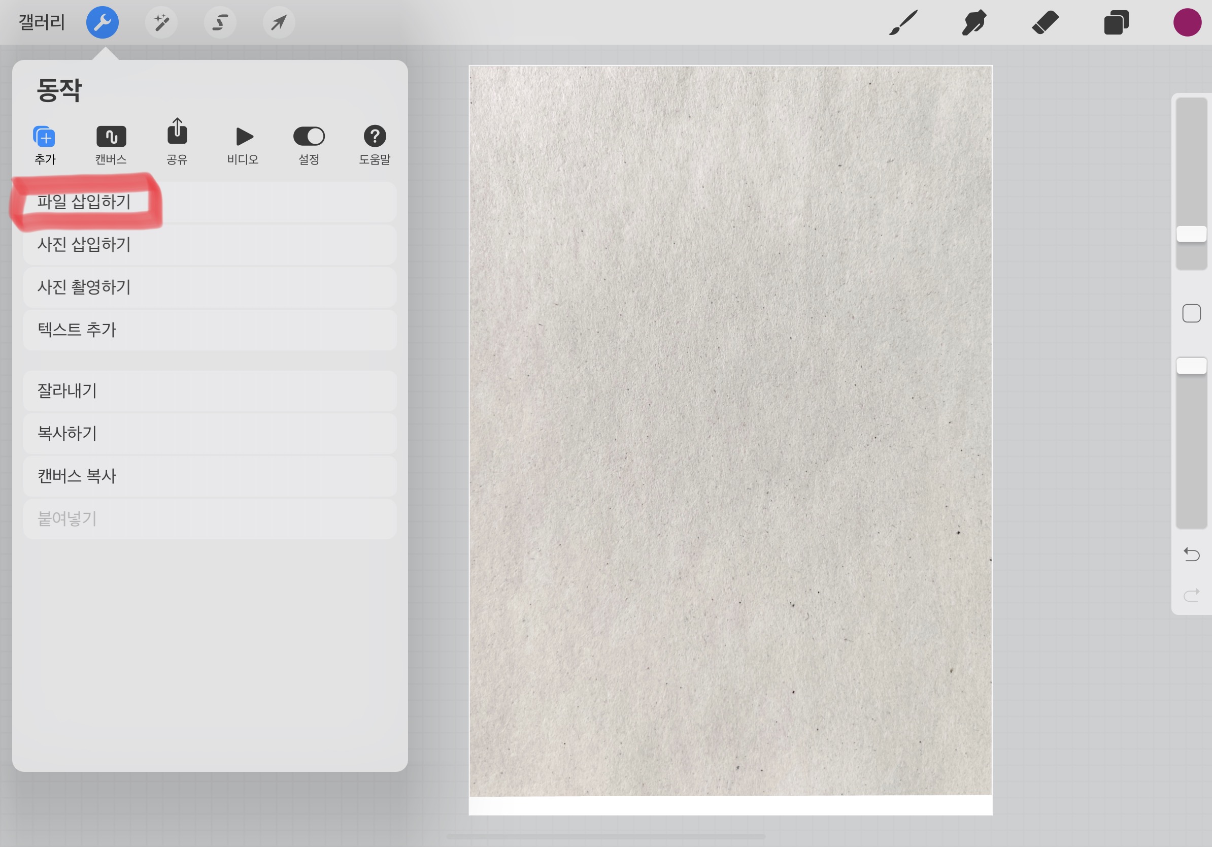 먼저 파일 삽입하기에서 캔버스를 선택해줍니다(레이어 1).