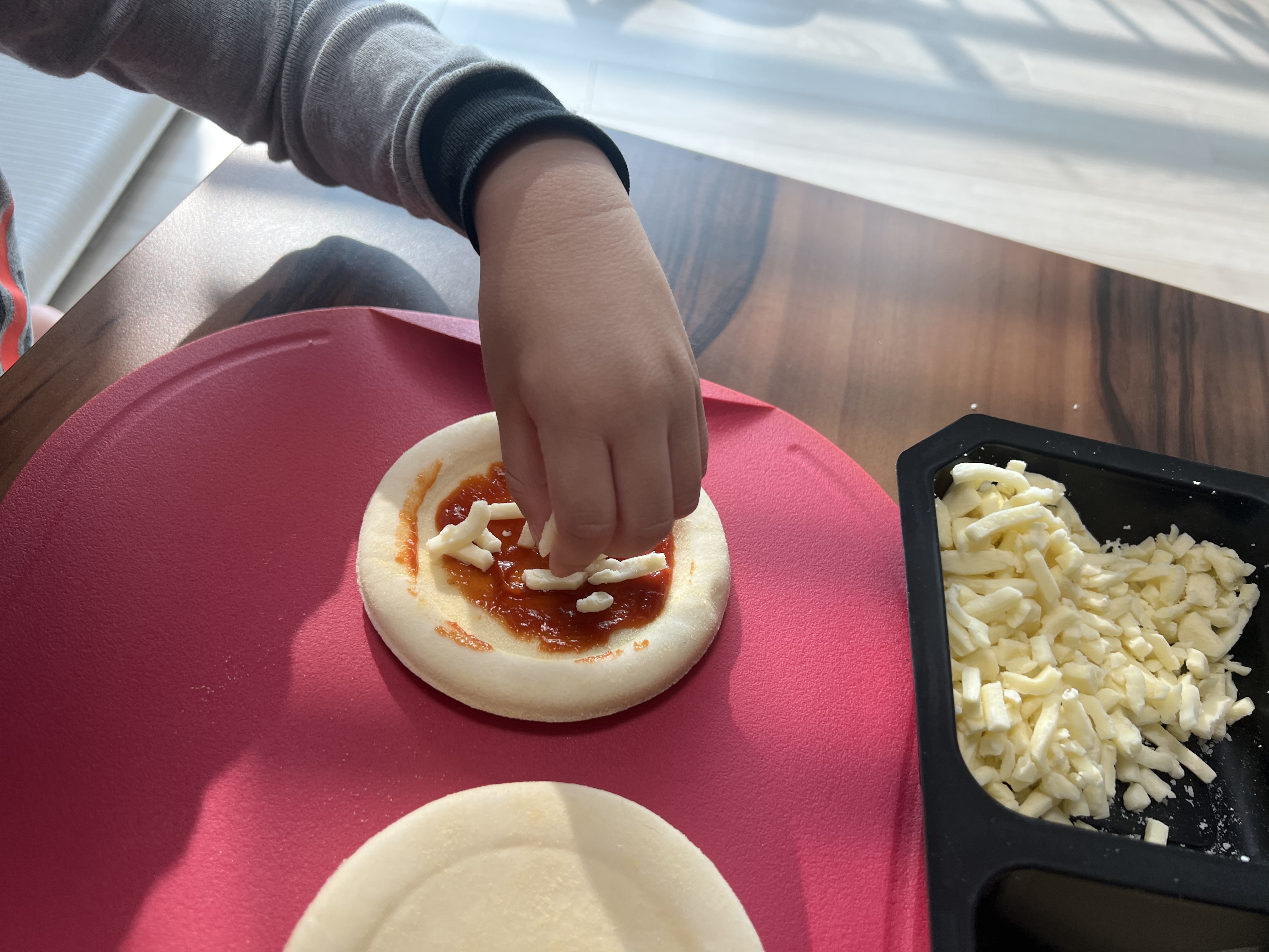고사리 같은 손으로 치즈 토핑 솔솔 뿌려주고 있어요ㅋㅋㅋ
