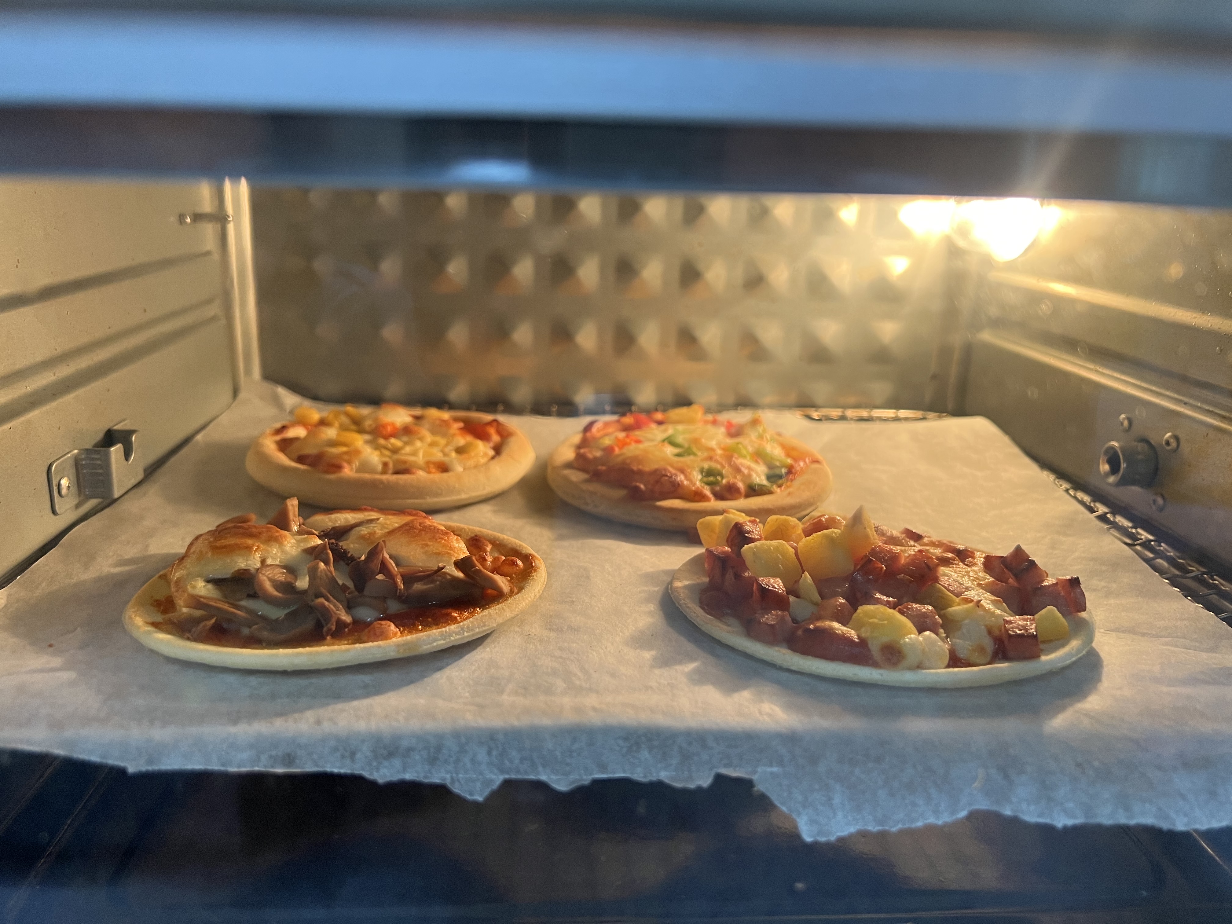 피자를 넣고 180도에서 8분 정도 구었습니다. 노릇노릇 잘 구워지고 있죠?