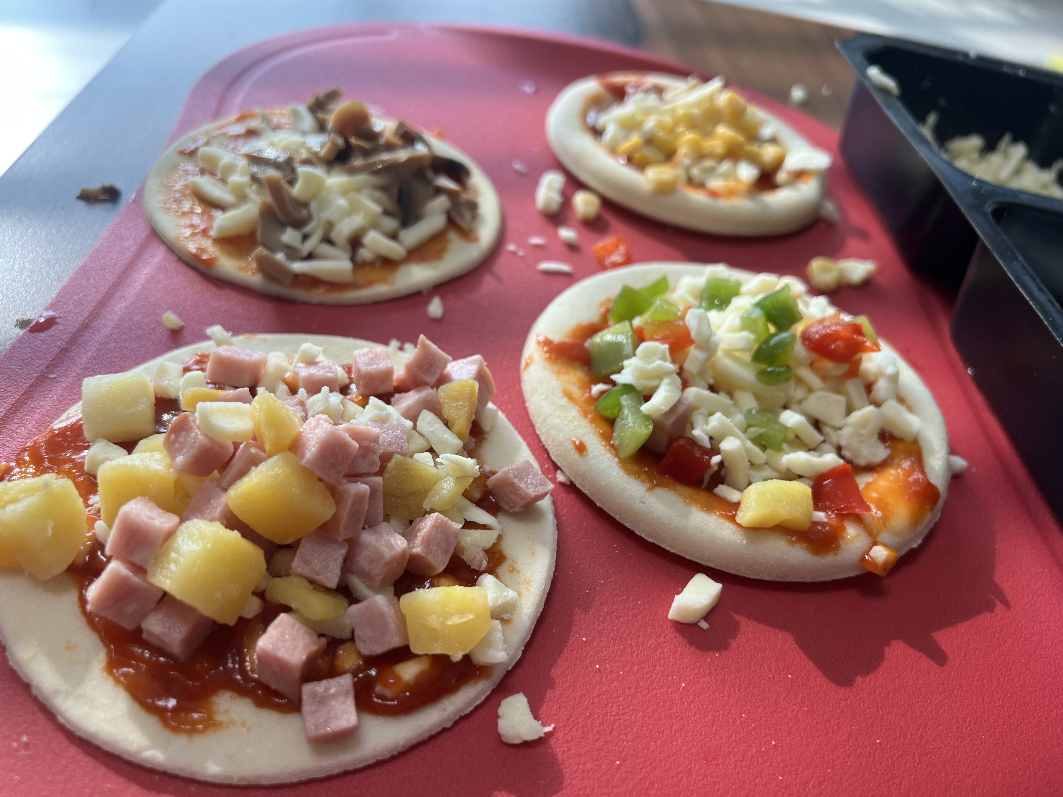 우리 준이는 4개의 도우에 차례로 토마토소스를 바르고, 치즈를 뿌리고, 각각 토핑을 따로따로 얹어 주네요.