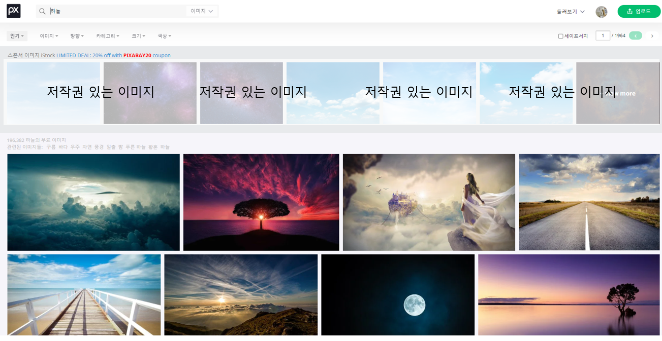 "하늘"이라고 검색하면 아래와 같은 멋진 이미지들이 검색됩니다.그런데 상단에 있는 이미지는 저작권이 있는 이미지이므로 무료로 사용이 불가능한 점 참고해주세요.